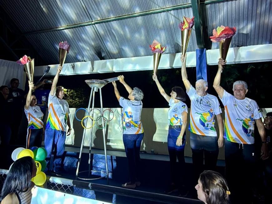 A tocha olímpica foi conduzida por professores aposentados, que simbolicamente acenderam a pira, celebrando a importância da educação e do esporte