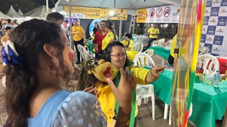Jogos lúdicos e brincadeiras sobre trânsito são desenvolvidos na tenda educativa do Detran-RO, engajando o público da festa folclórica de forma interativa