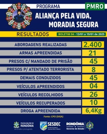 Entre o período de 13 e 19 de janeiro, foram realizadas 2,4 mil abordagens em diversos pontos, com o objetivo de desarticular grupos criminosos e garantir a segurança da população. O boletim oficial aponta, ainda que, ocorreram a apreensão de 21 armas de fogo; a captura de 45 suspeitos com mandados de prisão; 45 conduzidos à Delegacia de Polícia Civil (DPC), e 8 indivíduos presos por envolvimento em atentados que marcaram o início das tensões no estado.