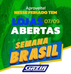 Encerrando a “Semana Brasil” a loja Gazin estará aberta amanhã feriado da independência do Brasil, das 8hs até às 13hs com condições especiais de pagamento. Na Gazin você encontra os melhores produtos, com qualidade e preços baixos, toda loja em 15 vezes no carnê. Toda equipe estará a disposição para atender os nossos clientes, afirmou a gerente da loja Luciana Reis.