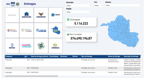 A Seas desenvolveu um painel de entregas que contempla programas como Mulher Protegida, Mamãe Cheguei e Vencer, com o objetivo de apresentar de forma clara e organizada, o número de entregas realizadas e os valores investidos em ações sociais em todo o estado de Rondônia.
