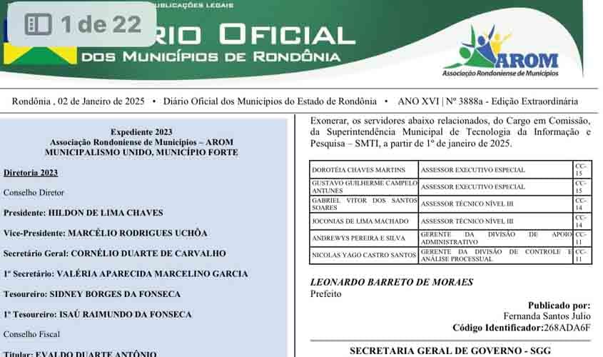A gestão do prefeito Léo Moraes, do PODEMOS, passa por uma reestruturação significativa. Na edição do Diário Oficial da AROM/RO, que será publicada por volta das 23h de hoje, está prevista a exoneração de mais de mil servidores, dando início a um novo ciclo na administração municipal.