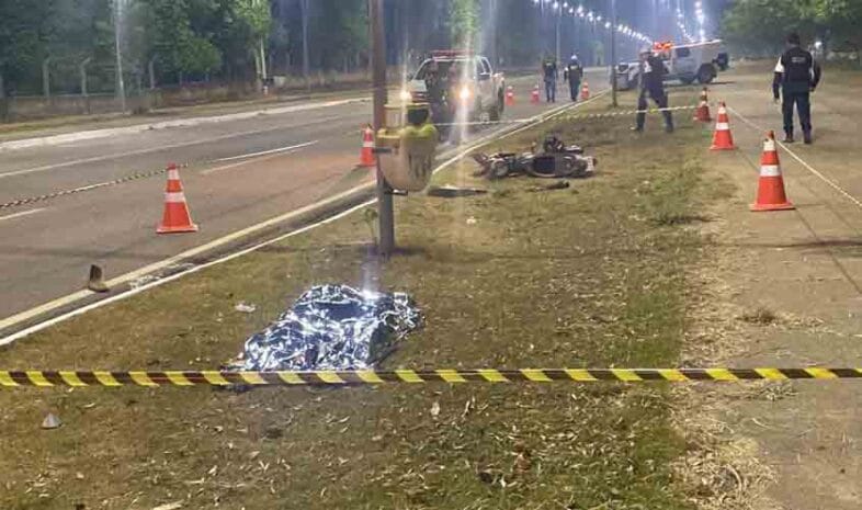 Descontrolado, o motociclista saiu da pista e colidiu violentamente contra um poste de iluminação pública, morrendo instantaneamente