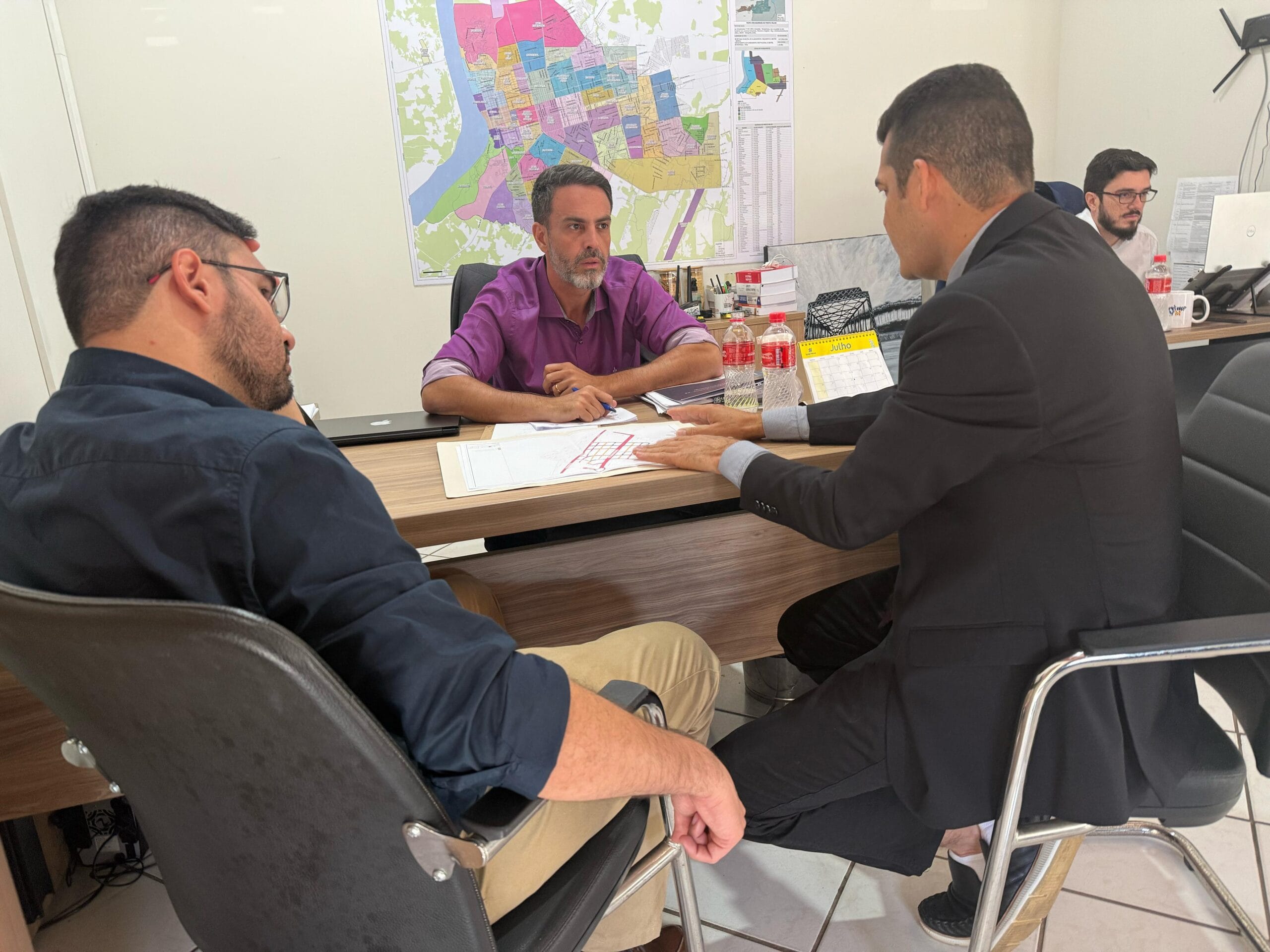 “Estamos discutindo aqui com o vereador Adalto, um amigo, uma pessoa que a gente confia muito, trabalhador e sério. Estávamos até aqui com o mapa das ruas que estão recebendo serviços, com execução, através de emendas do deputado Coronel Chrisóstomo, outros ainda da minha época de deputado federal, e também tratando desse projeto técnico da Avenida 03 de Dezembro”, destacou o prefeito.